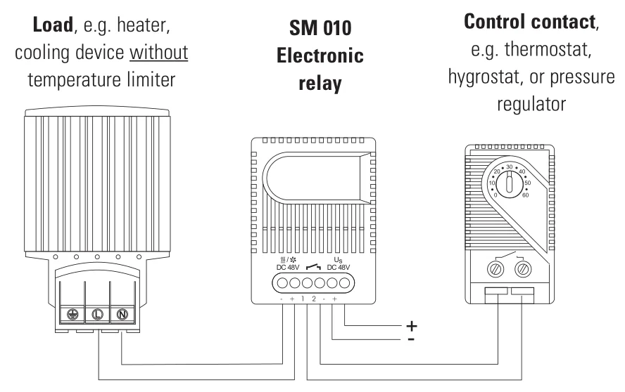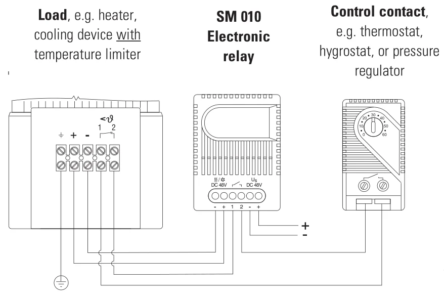 thermostat, hygrostat). The electronic relay is available in DC 24 V and DC 48 V versions.