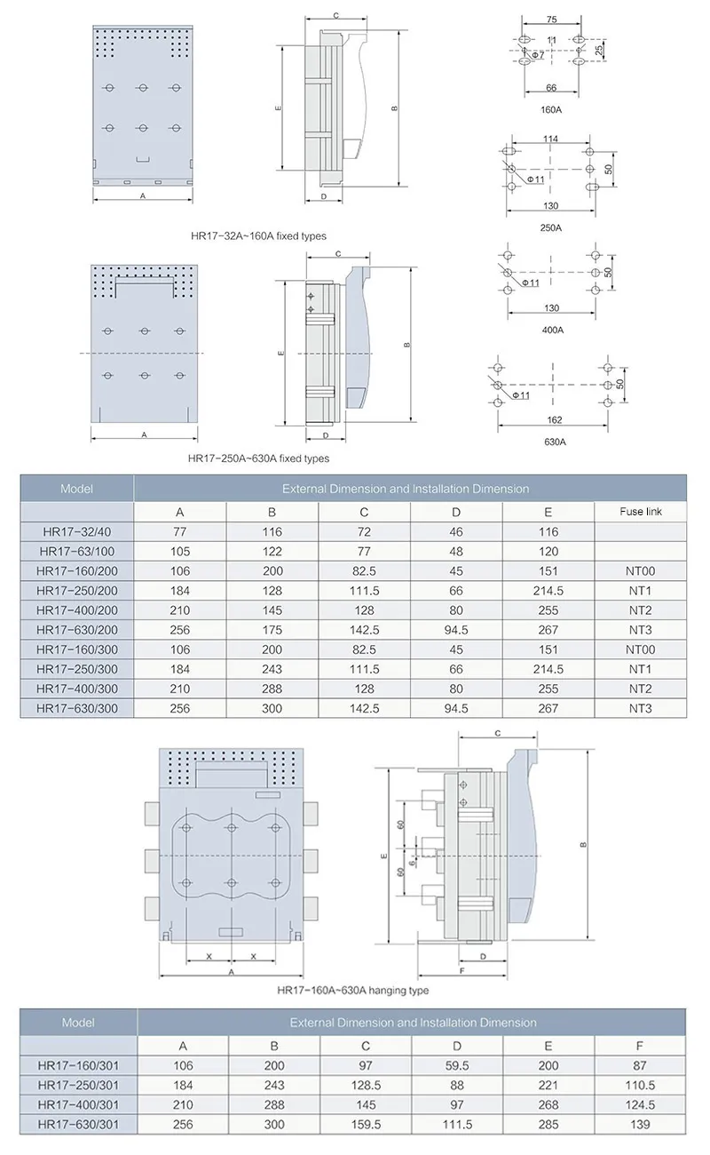 | Rated heating current | 160A, 250A, 400A, 630A | |||