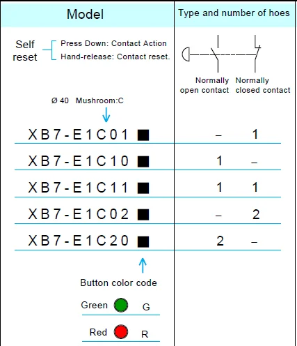 (2)The following model in the previous colum plus-C,e.g. XB7-E1C10G-C, plug-in wiring(2.8*0.8)
